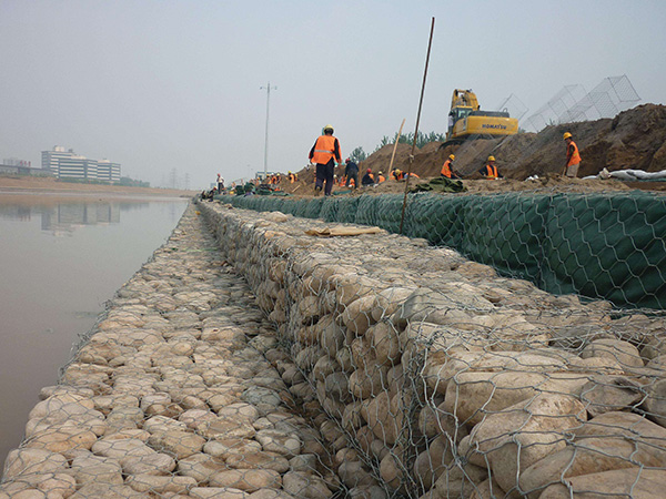 石籠網(wǎng)由高抗腐蝕、高強度、具有延展性的低碳鋼絲或者包覆PVC的以上鋼絲使用機械編織而成,使用該網(wǎng)制作而成的箱型結(jié)構(gòu)就是石籠網(wǎng)箱。根據(jù)ASTM和EN標準,所使用的低碳鋼絲直徑根據(jù)工程設(shè)計要求而不同。一般介于2.0-4.0mm之間,石籠網(wǎng)鋼絲的抗拉強度不少于38kg/m2,金屬鍍層重量一般高于245g/m2,石籠網(wǎng)片的邊緣線直徑一般要大于網(wǎng)線直徑。其雙線絞合部分的長度不得小于50mm.以保證絞合部分鋼絲的金屬鍍層和PVC鍍層不受破壞。