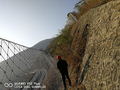 被動防護系統(tǒng)是由鋼絲繩網(wǎng),鋼絲格刪網(wǎng).錨桿,工字鋼柱,上下拉錨繩,減壓環(huán),底座及上下支撐繩等部件構(gòu)成.系統(tǒng)由鋼柱和鋼繩網(wǎng)聯(lián)結(jié)組合構(gòu)成一個整體,對所防護的區(qū)域形成面防護,從而阻止崩塌巖石土體的下墜,起到邊坡防護的作用.SNS被動防護系統(tǒng)的特點在于:系統(tǒng)的柔韌性和欄截強度足以分散傳遞預計的落石沖計沖擊動能,減壓環(huán)的設計和采用使系統(tǒng)的抗沖擊能力得到進一步提高.與鋼性攔截與砌漿擋墻相比:該變了原有施工工藝,使工期和資金得到減少.